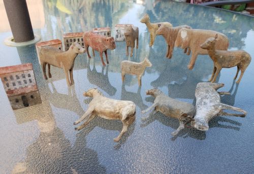 Lot Carved Primitive Wood Animals Horses Cows Dogs Deer Buildings