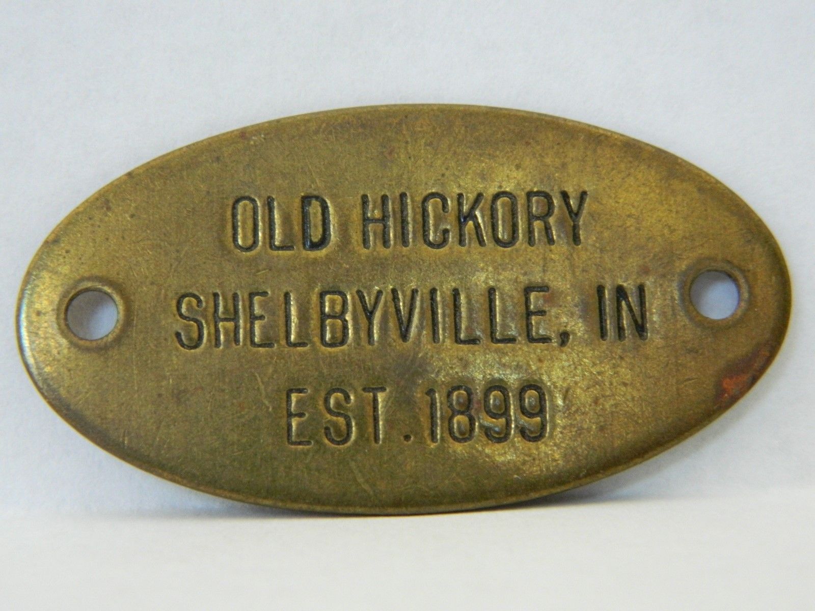 Title (ebay affiliate link): Vintage Old Hickory Rustic Chairs Shelbyville IN Oval Brass Id Tag 1 7/8" x 1"