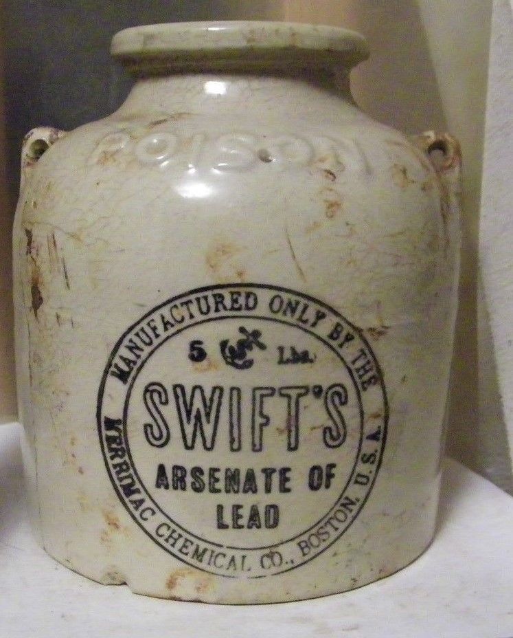 antique crock-Poison Swift''s arsenate of lead Marrimac Chemical co Boston,Mass