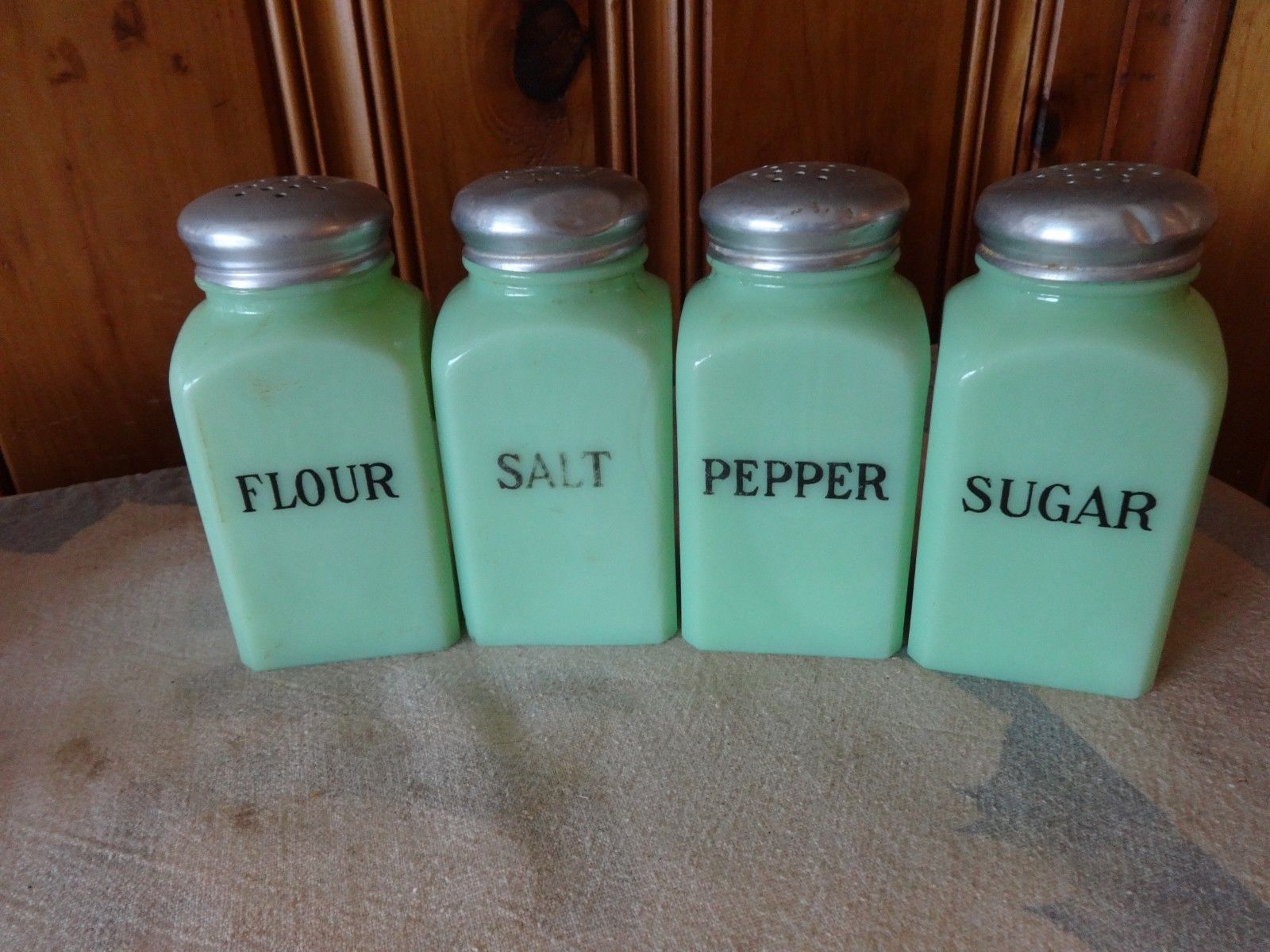 Title (ebay affiliate link): 4 Pc Jeannette Jadeite Green Range Shaker Set - Salt Pepper Sugar Flour