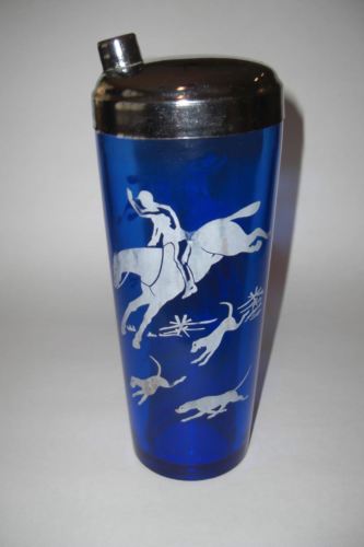 Title (ebay affiliate link): Hazel Atlas cobalt blue Fox Hunt depression glass cocktail shaker