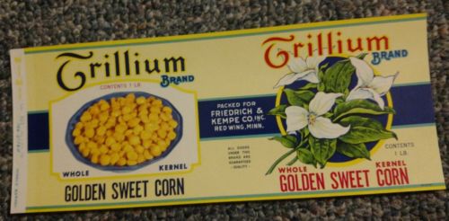 Title (ebay affiliate link): TRILLIUM Corn CAN LABEL FREIDRICH & KEMPE RED WING MINNESOTA FLOWER ORIGINAL