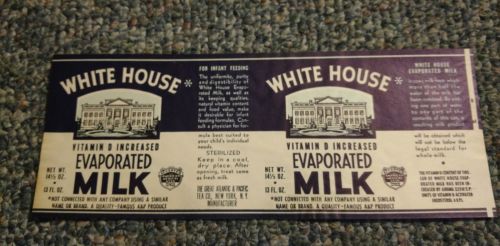 Title (ebay affiliate link): A&P WHITE HOUSE EVAPORATED MILK CAN LABEL ORIGINAL WW2 VINTAGE! 1941-1945 RARE