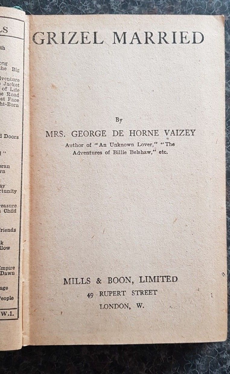 Title (ebay affiliate link): "Grizel Married" by Mrs. George De Horne Vaizey (1st Edition,1914, Mills & Boon)