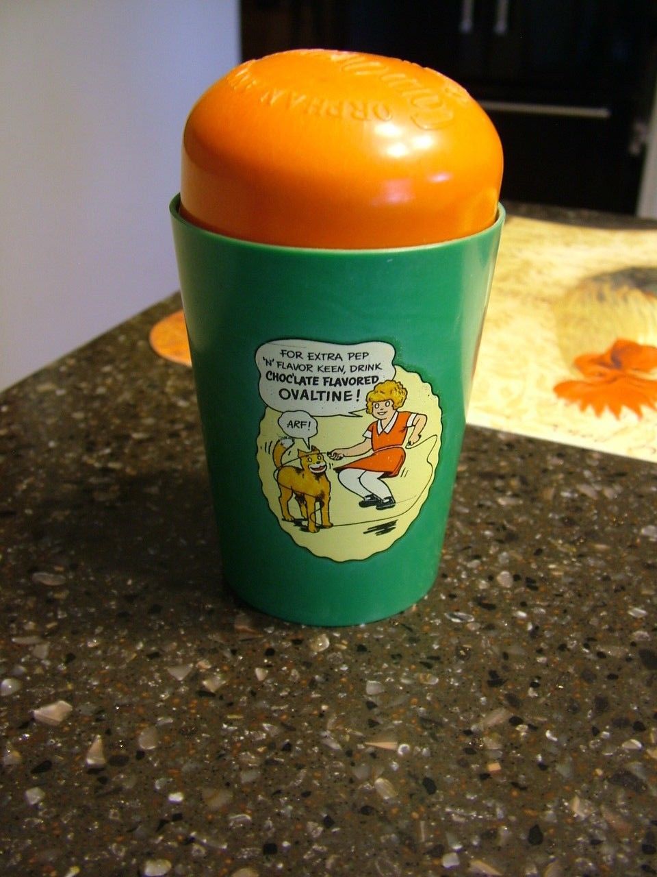 Title (ebay affiliate link): 1938 Little Orphan Annie Ovaltine Plastic Shake-Up Mug Green w/Orange Lid