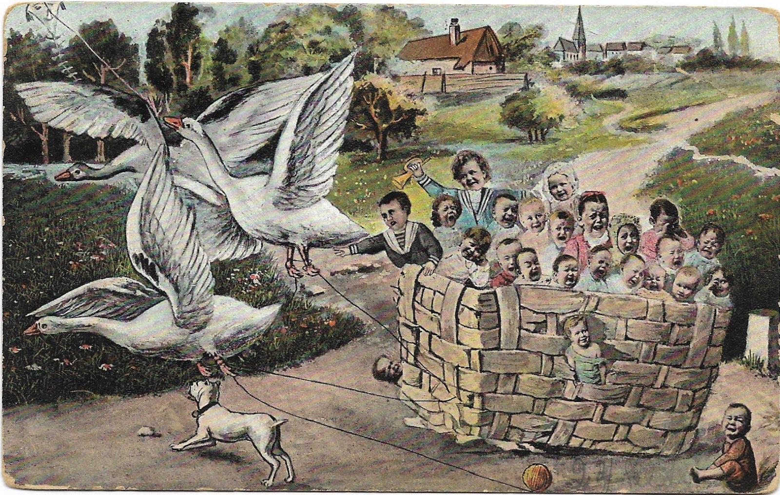 DB postcard 1907, geese pulling away a basket of young children, dog