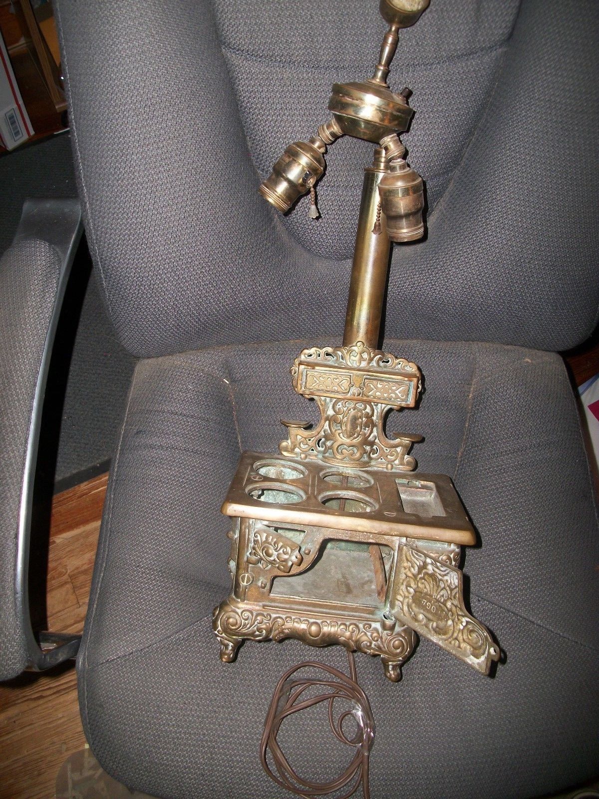 Title (ebay affiliate link): Eagle Toy Stove, salesmans sample converted to light with parts Brass