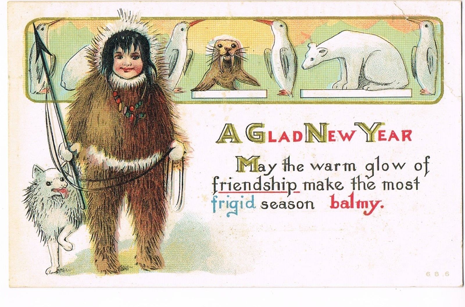 Title (ebay affiliate link): ANTIQUE NEW YEAR Postcard YOUNG ESKIMO LADY, HUSKY, POLAR BEAR, SEAL, PENGUINS