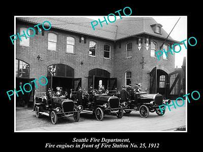OLD LARGE HISTORIC PHOTO OF SEATTLE FIRE DEPARTMENT TRUCKS & STATION No 25 c1912