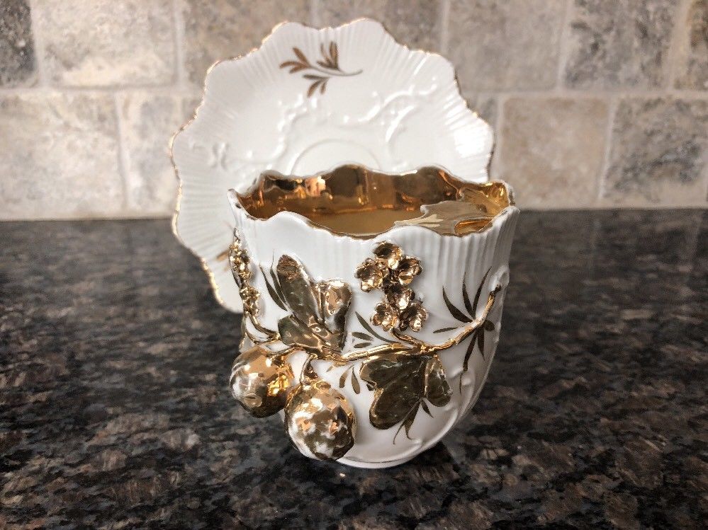 Title (ebay affiliate link): Porcelain Gold Flowers Mustache Cup and Saucer w/ Gold Trim Right Hand