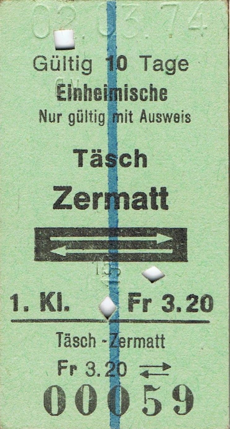 Railway tickets Switzerland Tasch to Zermatt first class return 1974