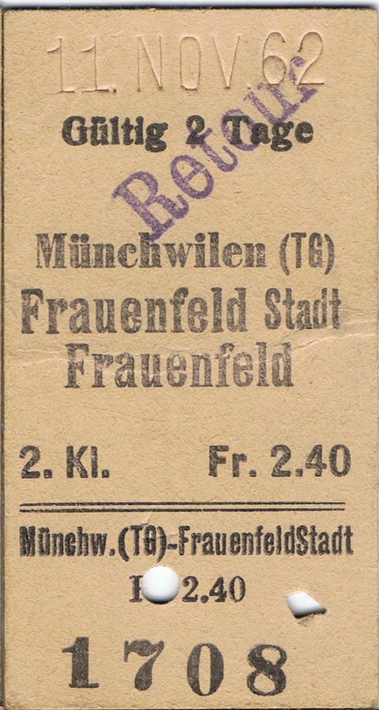 Railway tickets Switzerland Munchwilen to Frauenfeld second class single 1962
