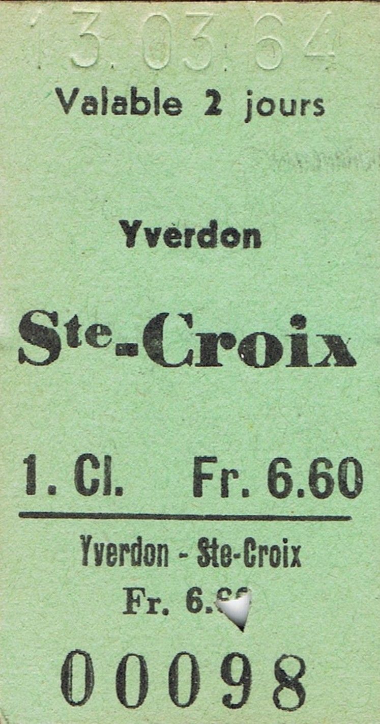 Railway tickets Switzerland Yverdon to Ste-Croix first class single 1964