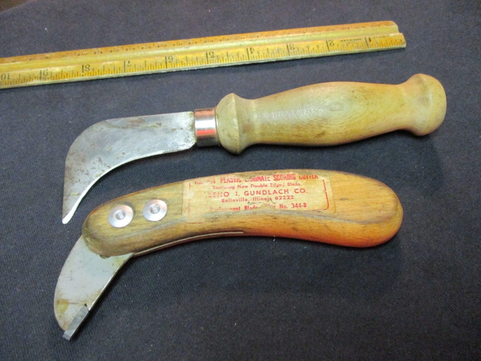 2 VINTAGE UTILITY KNIVES/CUTTING TOOLS/GUNDLACH-LAMINATE SCORING CUTTER/CARPET C