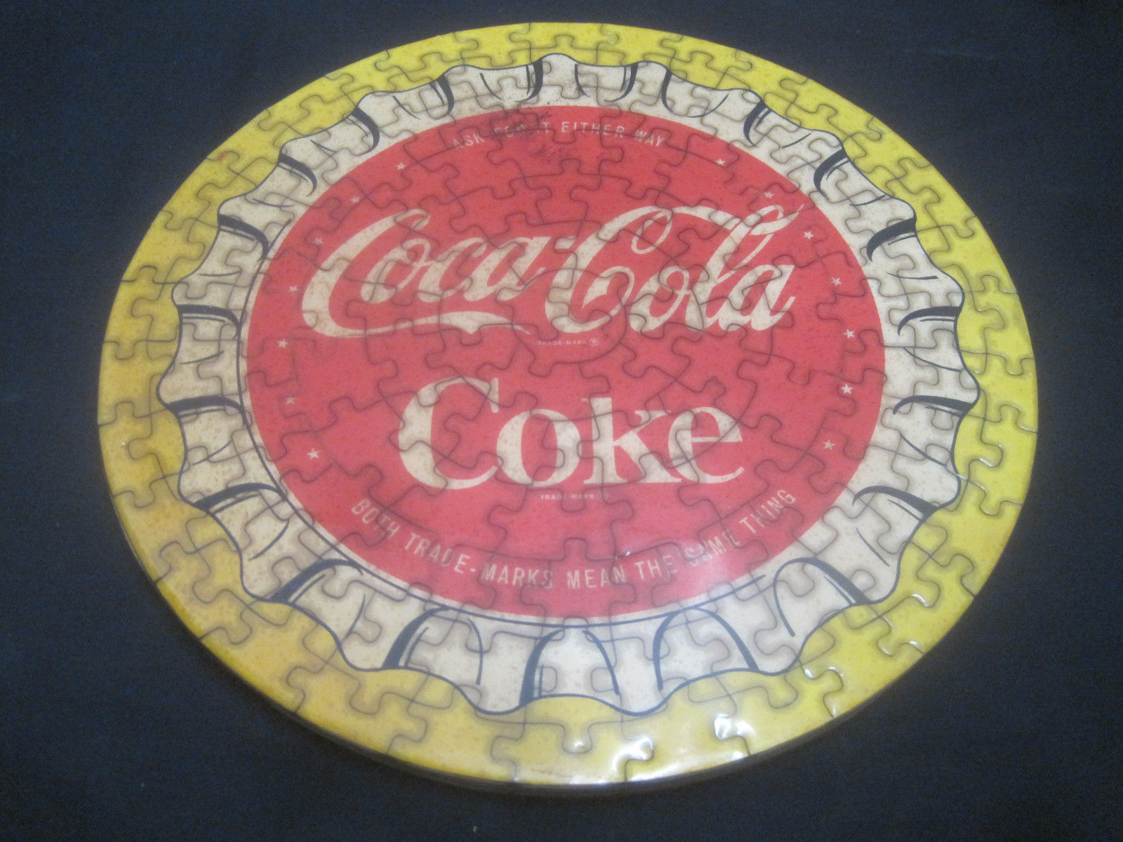 Title (ebay affiliate link): Vintage 11 1/2" Lacquered Clear Coat Wood Backing Coca-Cola Puzzle Bottle Cap.