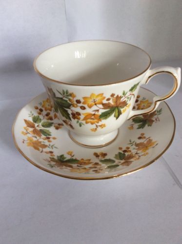 Title (ebay affiliate link): Queen Anne Bone China tea Cup #8606 & Saucer fall leaves gold trim mint