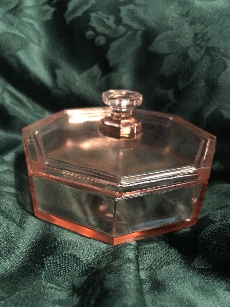 Title (ebay affiliate link): Vintage lidded pink (Depression ?) glass octagonal box