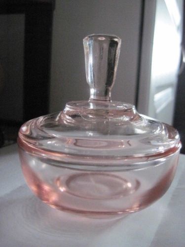 Title (ebay affiliate link): Vintage Pink Depression Glass Covered Candy Trinket Dish w/ Knob
