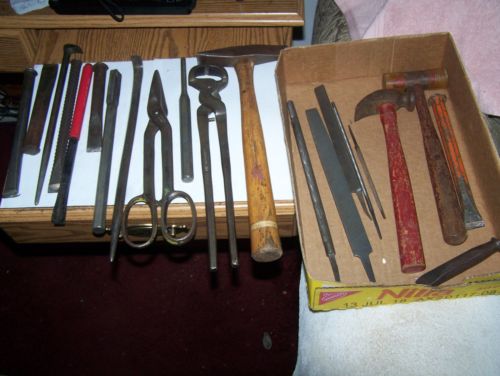 Title (ebay affiliate link): VINTAGE BLACKSMITH TOOLS NIPPERS HAMMER COLD CHISELS METAL FILES TIN SNIPS ETC.