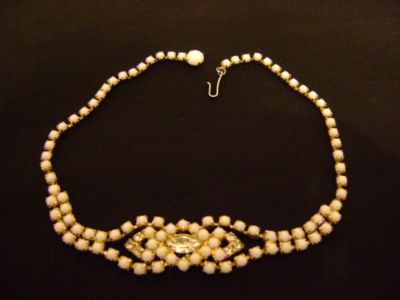 Vtg Vendome Milk Glass + Rhinestone Necklace Milk Glass