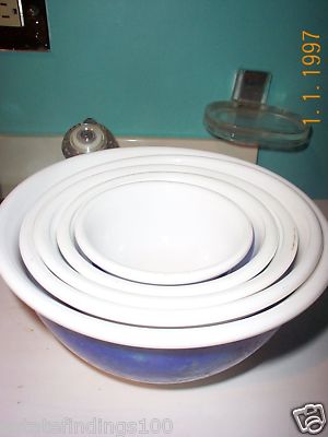 set of 5~milk glass~blue band~mixing bowls~5,6,7,8,9" D