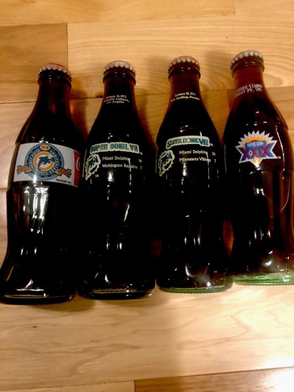 Title (ebay affiliate link): Miami Dolphins 8 Oz Coke Bottles Super Bowls VII, VIII XXIX Perfect 17-0 Season