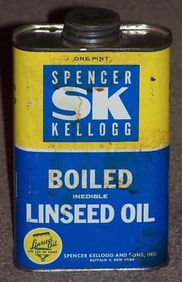 VINTAGE SPENCER KELLOGG 1 PINT BOILED LINSEED OIL TIN CAN, MOSTLY FULL