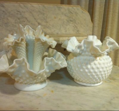 1970 FENTON HOBNAIL MILK GLASS CRIMP VASE SET
