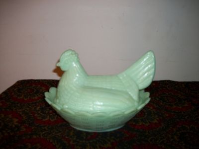 DEPRESSION MILK GLASS GREEN HEN ON A NEST CONTAINER
