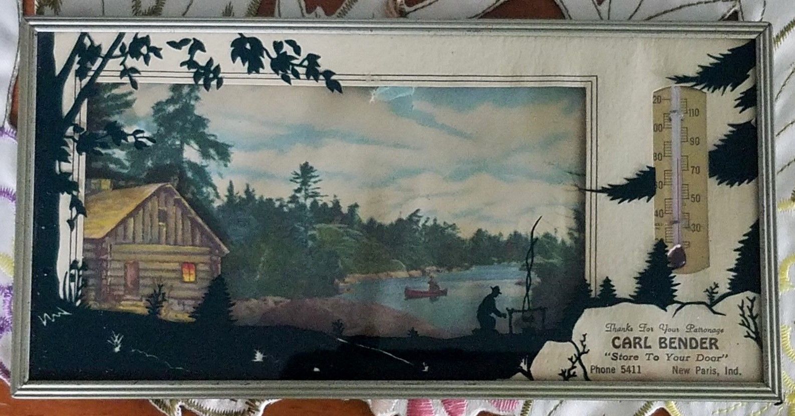 Vintage Advertising REVERSE PAINTED THERMOMETER w/Log Cabin, Campfire