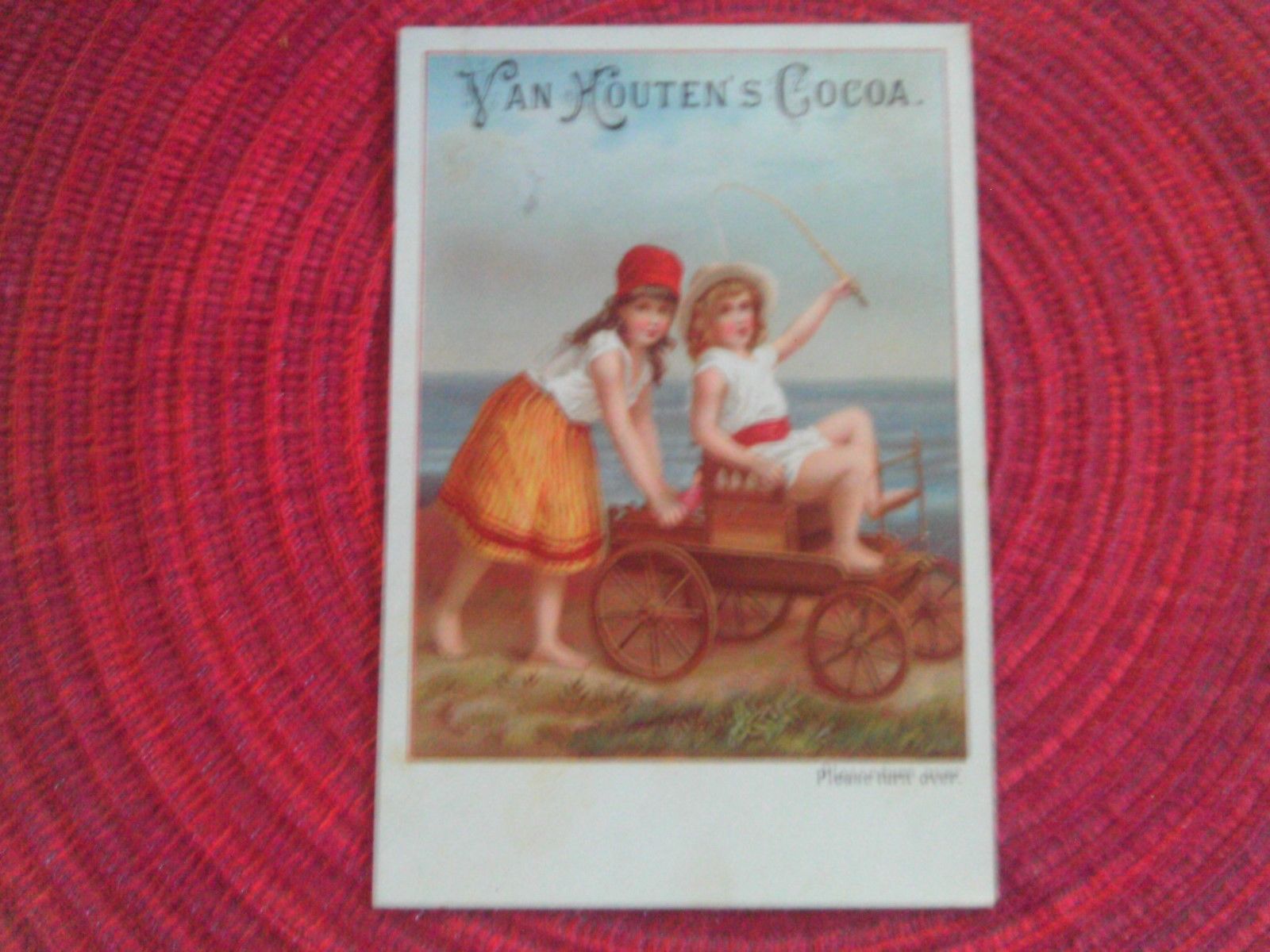 Title (ebay affiliate link): RARE 1880s TRADE CARD AD VAN HOUTENs CHOCOLATE ROYAL COCOA FACTORY HOLLAND WAGON