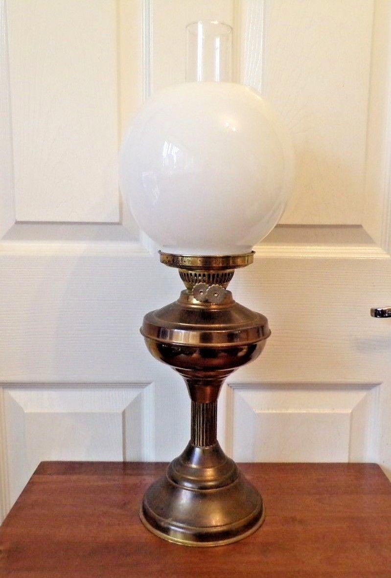Title (ebay affiliate link): vintage brass oil lamp with white globe shade Duplex twin burner working order