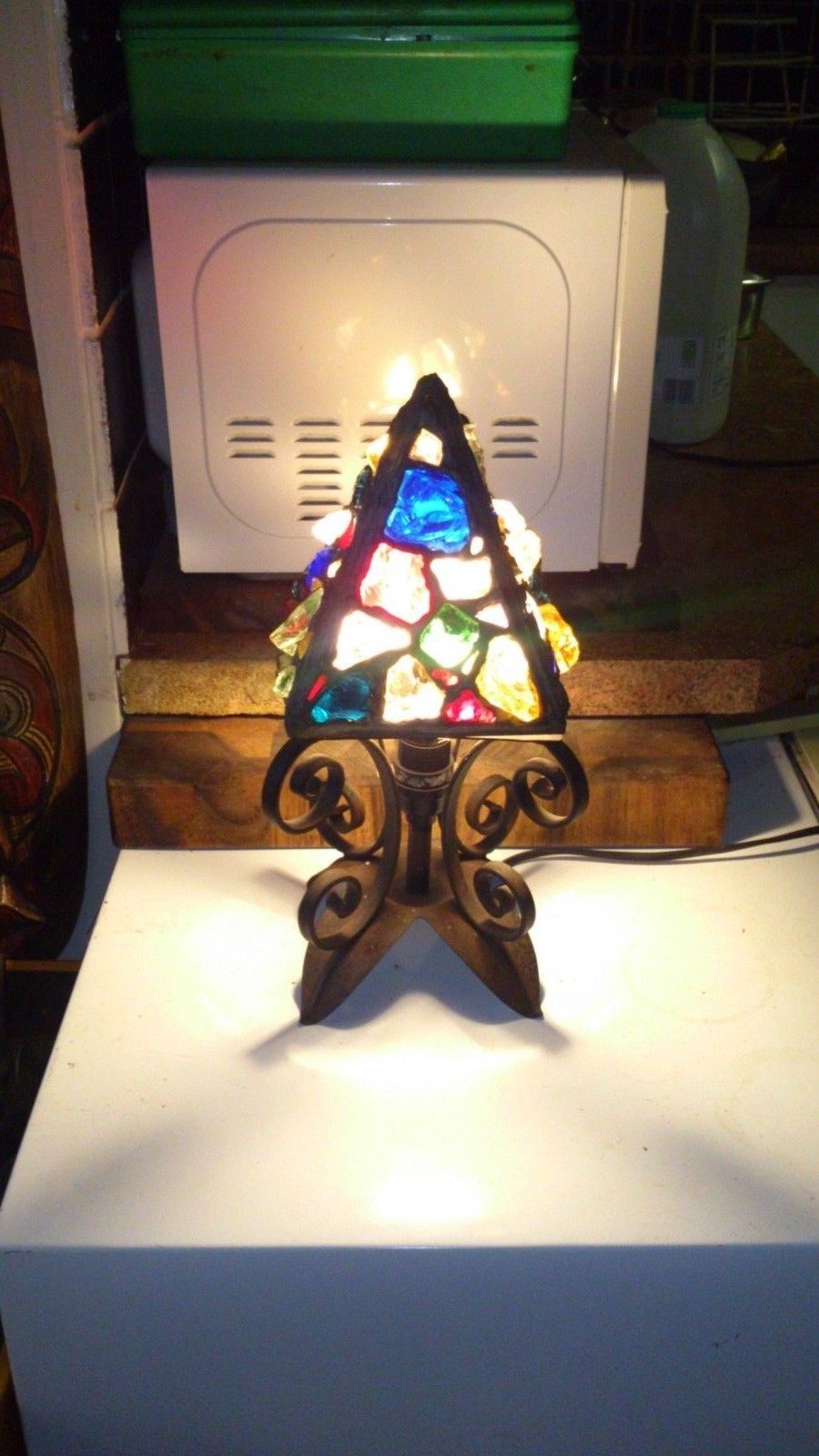Title (ebay affiliate link): VINTAGE PETER MARSH ROCK GLASS WROUGHT IRON TABLE LAMP ARTS & CRAFTS 1950 '' S