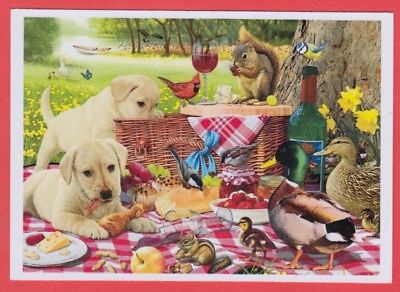 "Picnic", puppies, squirrel, ducks, wine, strawberry, Russian modern postcard