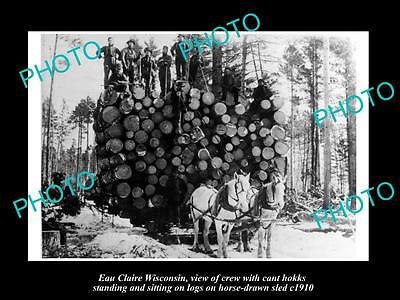 OLD LARGE HISTORIC PHOTO OF EAU CLAIRE WISCONSIN, LOGGING TEAM WITH SLED c1910 2