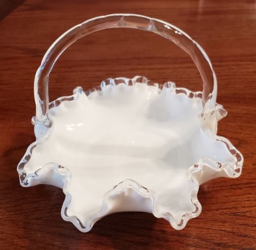 Title (ebay affiliate link): Vtg Fenton White-Milk-Glass-Ruffle--Basket-Bowl-w/Clear Handle