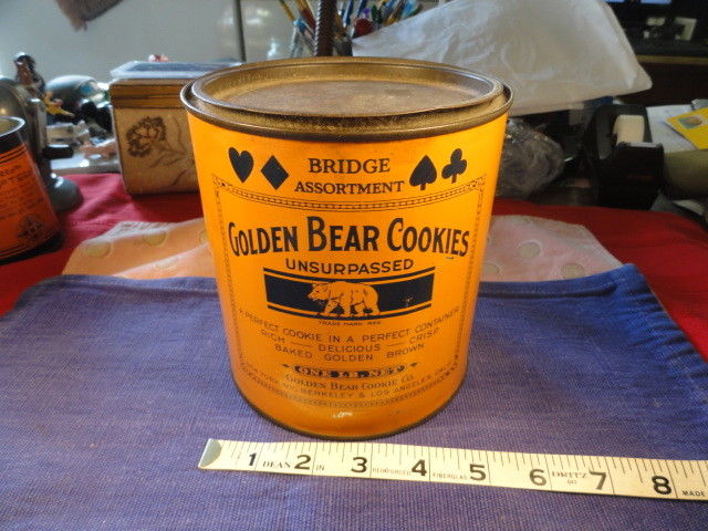 Title (ebay affiliate link): Golden Bears Cookies One Pound Tin w Lid Orange/Black 6" Tall