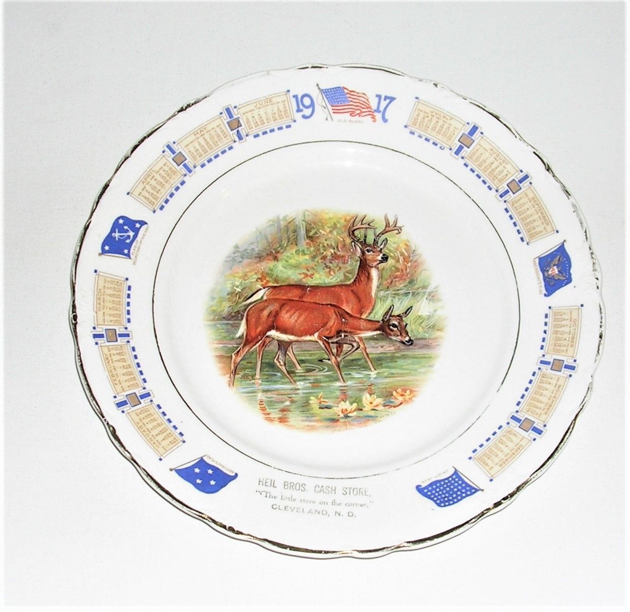 Title (ebay affiliate link): Antique Calendar Plate, 1917 Cleveland, North Dakota, Heil Bros. USA Navy Flags