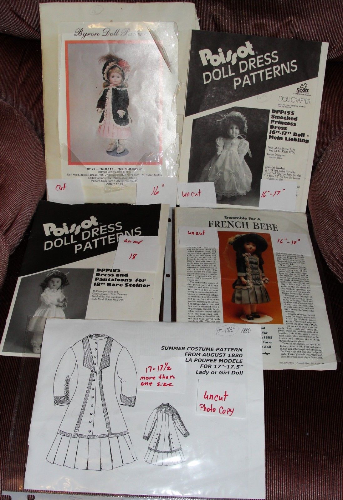 Lot of 5 Doll dress patterns;doll size 16"-18" ;antique,vint.,Ger. china dolls