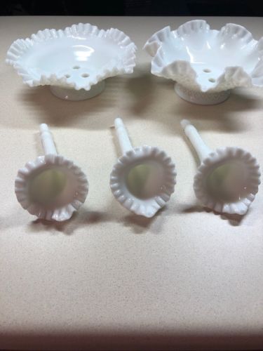 VINTAGE FENTON MILK GLASS 3 HORN DIAMOND LACE HOBNAIL EPERGNE 2 Bowls 3 Horns