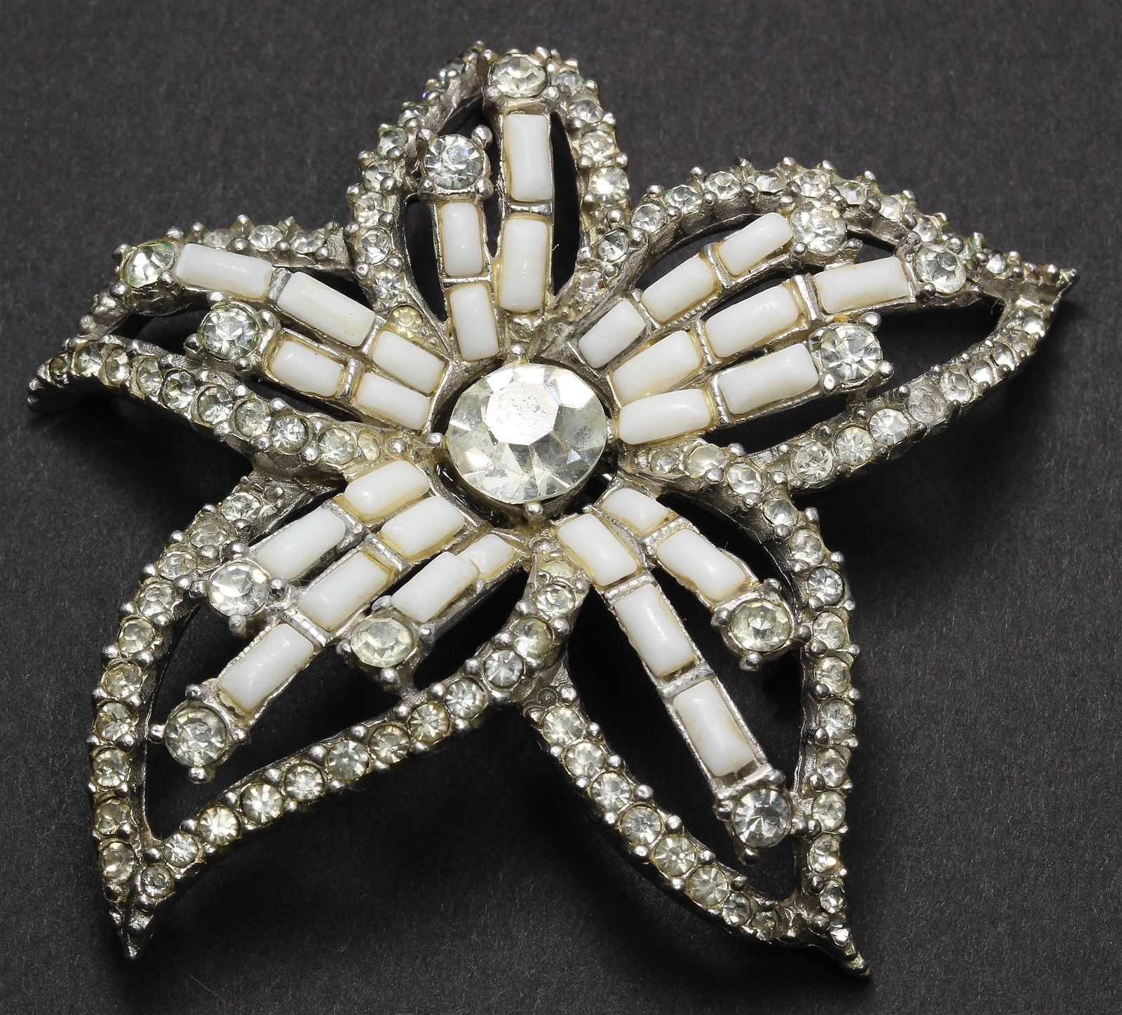 Title (ebay affiliate link): Vintage Art Deco Style Ornate Milk Glass Baguette Rhinestone Flower Brooch Pin