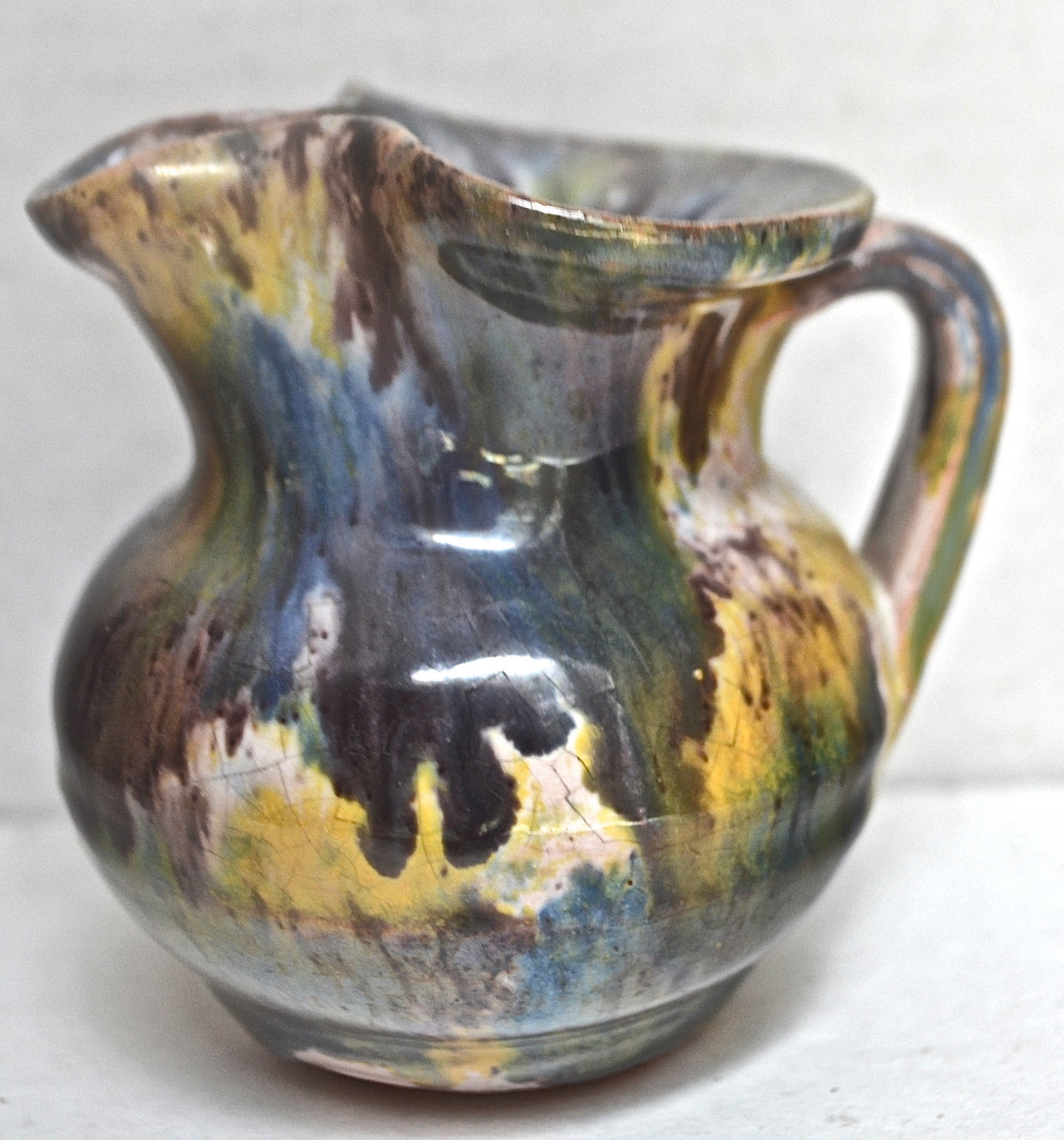 19th c Antique Multi Glaze Redware Pottery Creamer Pitcher