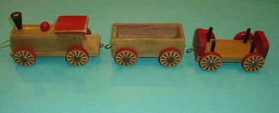 Vintage Brio like Wooden Train Pull Toy Engine & 2 Cars