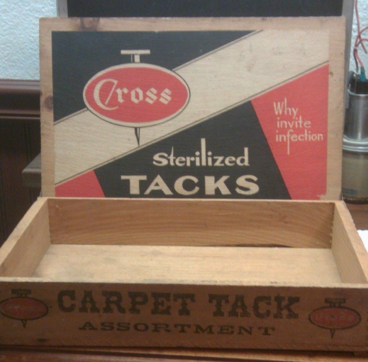Title (ebay affiliate link): Store Counter Top Advertising Box CROSS Carpet Tacks colorful Old Label Wooden