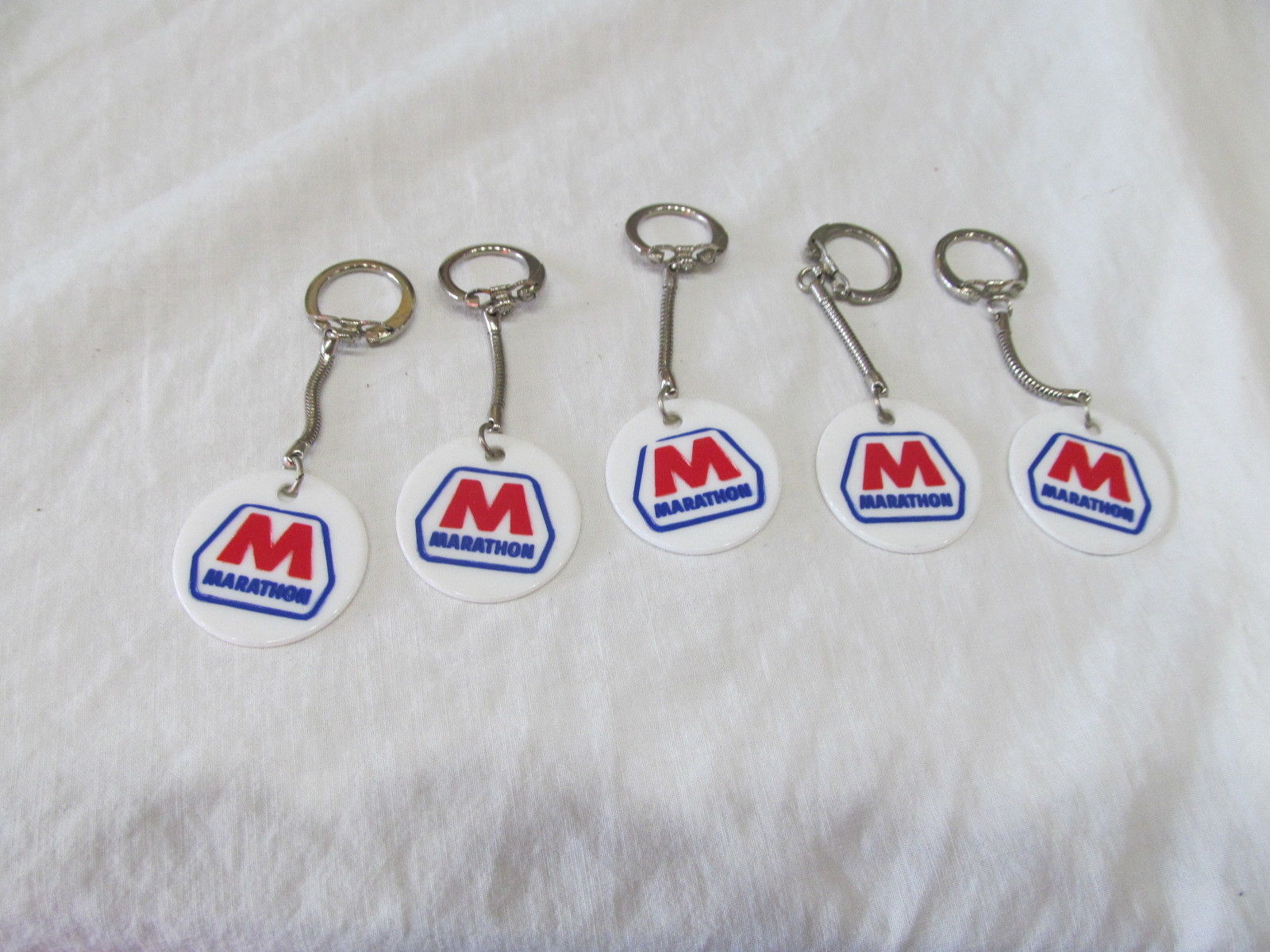 Title (ebay affiliate link): FIVE VINTAGE MARATHON GAS & OIL KEY CHAINS, 1 3/8" ACROSS