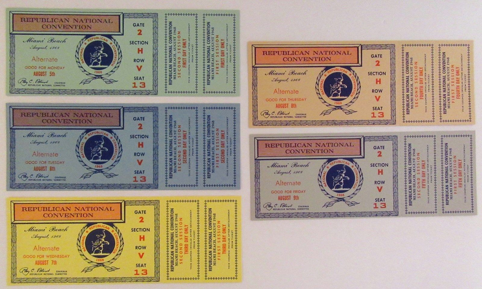 Title (ebay affiliate link): 1968 Republican National Convention ALTERNATE Tickets, Set of 5, Unused w/ Env.