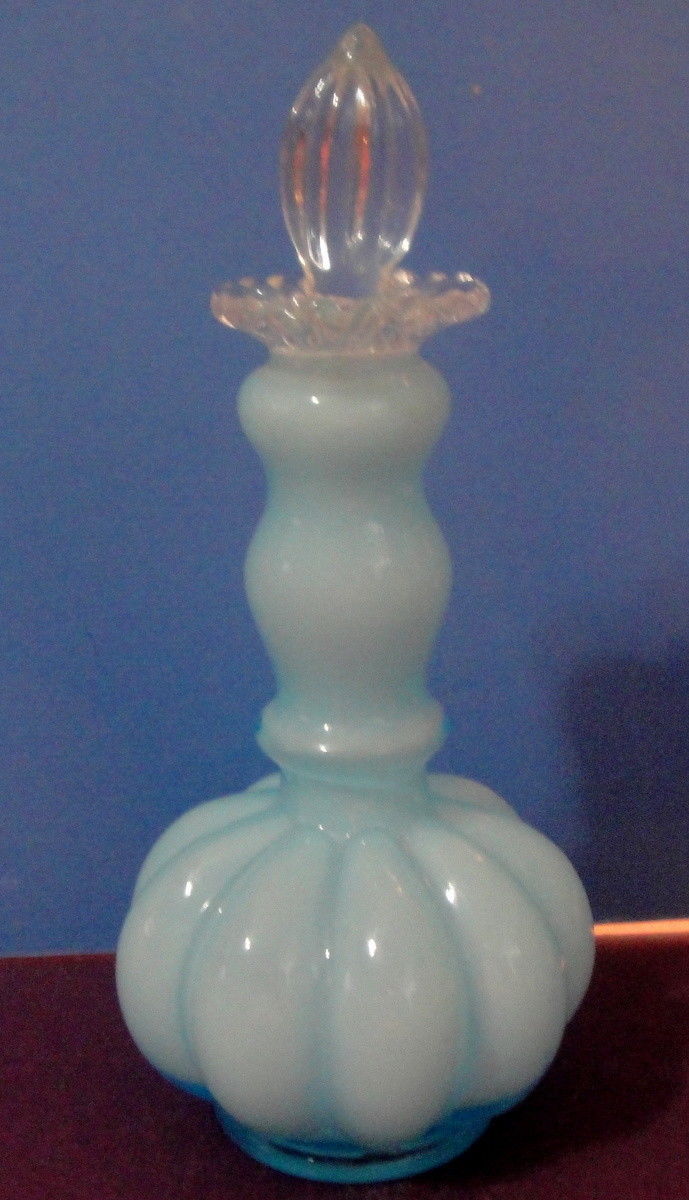 Title (ebay affiliate link): Vintage Fenton Blue Milk Glass Perfume Bottle with glass stopper