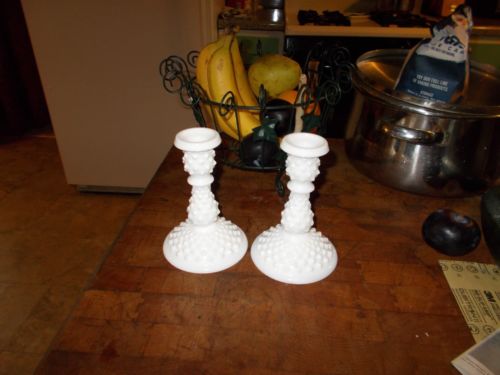 Title (ebay affiliate link): Vintage Pair Fenton Hobnail Milk Glass Tall Candle Stick Holders