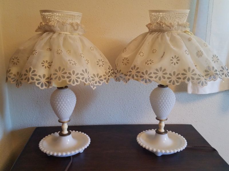 Antique Hobnail Milk Glass Lamp Pair with Linen Shades