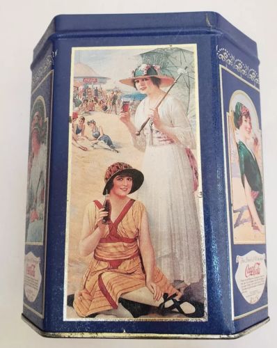 Title (ebay affiliate link): 1994 Blue Coca Cola Tin Can Ladies on a Beach Drinking a Bottle or Glass of Coke